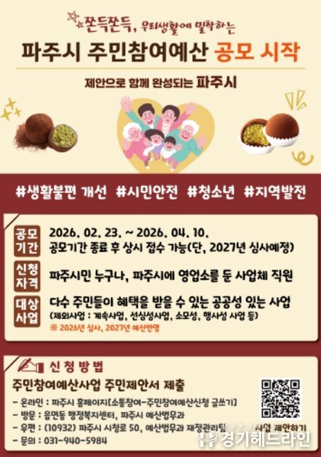 [경기헤드라인=김홍량 기자] 파주시는 2027년도 예산 편성에 반영할 주민참여예산 시민 제안을 오는 4월 10일까지 접수한다.