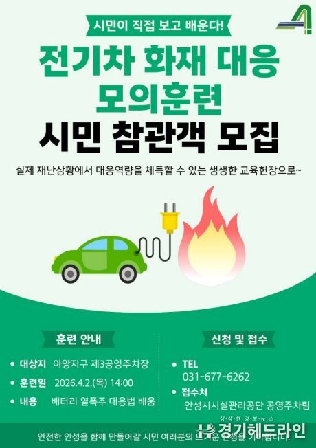 [경기헤드라인=문수철 기자] 안성시시설관리공단은 오는 4월 2일 목요일 오후2시 안성시 옥산동 소재 아양지구 제3공영주차장에서 ‘시민과 함께하는 2026년 재난대응 모의훈련’을 실시한다고 밝혔다.