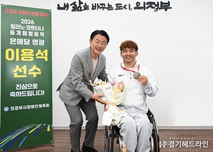 [경기헤드라인=김성구 기자] 의정부시장애인체육회는 24일 오전 시장실에서 ‘2026 밀라노·코르티나 동계 패럴림픽’ 휠체어 컬링 믹스더블 종목에서 은메달을 획득한 이용석 선수를 초청해 격려식을 개최했다.