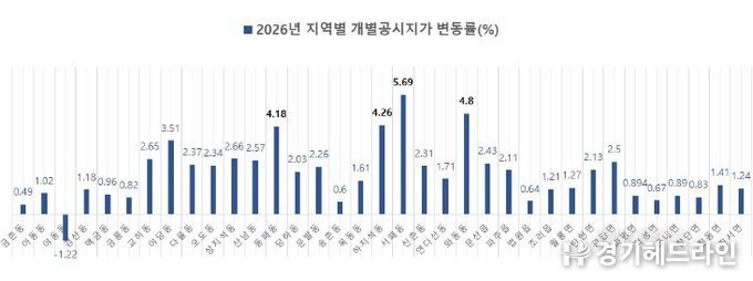지역별 상승률은 메디컬클러스터 등 개발 수요의 영향으로 운정지역 서패동 5.69%, 와동동 4.8%, 하지석동 4.26%, 동패동 4.18%로 다소 높게 나타났다. 개별토지 기준 최고 지가는 금촌동 54-27번지 상업용지가 제곱미터(㎡)당 5,765,000원, 와동동 1472-1번지 중심상업용지가 제곱미터(㎡)당 5,243,000원으로 확인됐다.