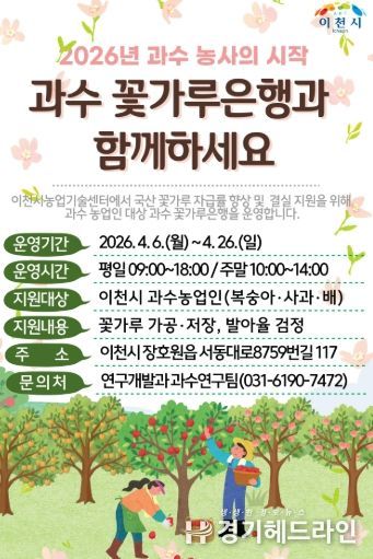 [경기헤드라인=정현수 기자] 이천시는 개화기 이상기후로 인한 결실 불량과 꽃가루 수급 불안에 대응하기 위해 오는 4월 6일부터 26일까지 3주간 ‘과수 꽃가루은행’을 운영한다.