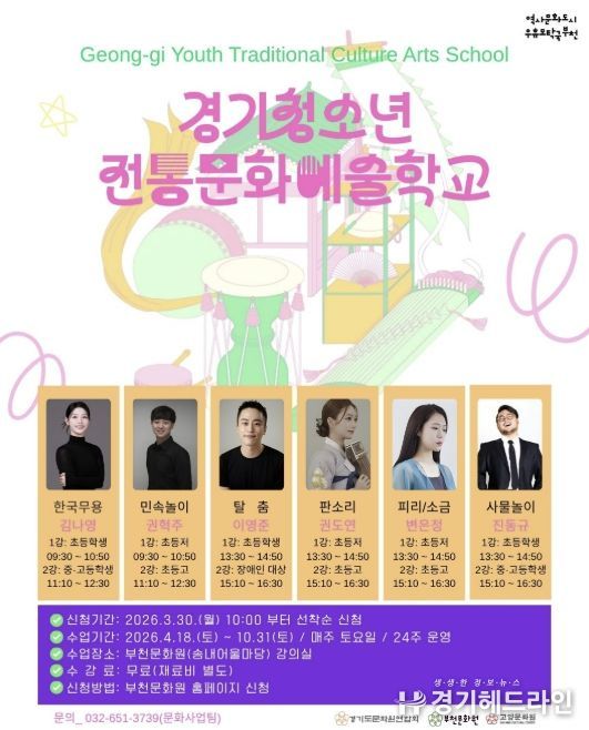 [경기헤드라인=문수철 기자] 부천문화원은 청소년들의 전통문화 참여 기회를 확대하고 경기지역 전통민속예술의 지속 가능한 전승 기반 마련을 위한 ‘2026 경기청소년전통문화예술학교’ 참여 학생을 모집한다.