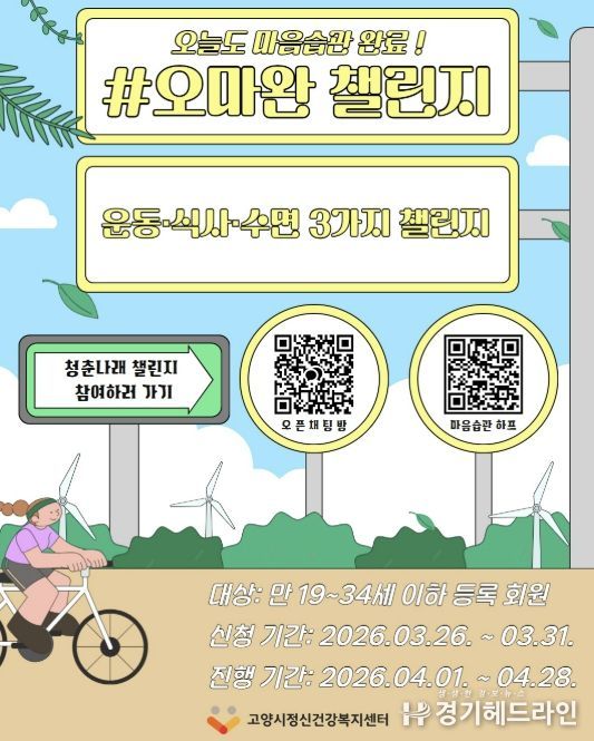 [경기헤드라인=김홍량 기자] 고양시정신건강복지센터는 청년들의 건강한 생활습관 형성을 지원하기 위해 온라인 집단 프로그램 ‘#오마완(오늘도 마음습관 완료) 챌린지’를 오는 31일까지 참여자를 모집한다.