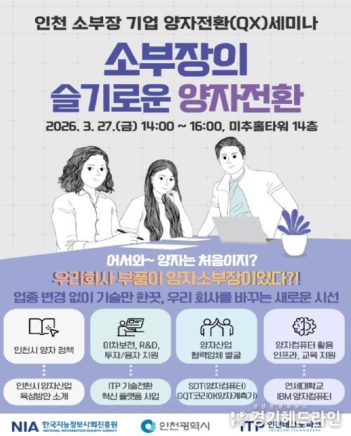 [경기헤드라인=문수철 기자] 인천광역시는 3월 27일 송도 미추홀타워에서 지역 소재·부품·장비(소부장) 기업을 대상으로 '양자전환(QX) 세미나'를 열고, 양자기술 기반 산업 적용과 기업 간 협력 네트워크 구축 방안을 모색했다.