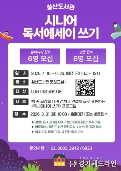 [경기헤드라인=문수철 기자] 광명시 철산도서관이 신중년 대상 ‘시니어 독서에세이 쓰기’ 프로그램 수강생을 오는 31일부터 모집한다.