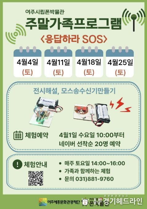 이순열 여주세종문화관광재단 이사장은 “이번 4월 프로그램은 통신의 출발점인 모스 신호를 직접 체험하며 과학적 원리를 배우는 동시에 가족 간 소통의 즐거움을 느낄 수 있는 시간”이라며 “아이들에게는 호기심과 탐구심을, 가족에게는 특별한 추억을 선사하는 기회가 되길 바란다”고 전했다.