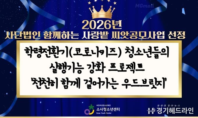 [경기헤드라인=문수철 기자] 부천여성청소년재단이 운영하는 소사청소년센터가 사단법인 함께하는 사랑밭 주관 ‘2026년 함께하는 사랑밭 [씨앗공모사업]’ 기획공모 분야에 ‘학령전환기(코로나키즈) 청소년들의 실행기능 강화 프로젝트-천천히 함께 걸어가는 우드브릿지’ 프로그램이 선정됐다.