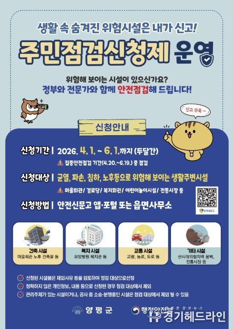 [경기헤드라인=문수철 기자] 양평군은 군민의 눈높이에서 지역 사회의 안전 사각지대를 해소하기 위해 ‘2026년 집중안전점검 주민점검신청제’를 본격 운영한다고 밝혔다.