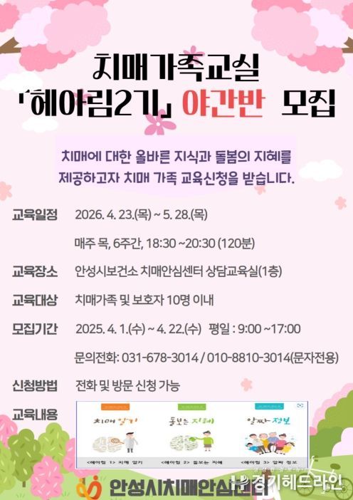 [경기헤드라인=문수철 기자] 안성시보건소 치매안심센터가 직장이나 생업으로 낮시간대 교육받기 어려운 치매환자 가족을 위하여 오는 23일부터 가족교실 야간반을 운영한다.