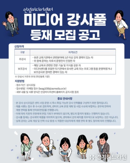 [경기헤드라인=문수철 기자] 안성시는 4월 1일부터 보다 체계적이고 전문적인 미디어 교육 운영을 위해 ‘미디어 강사풀’ 등재 강사를 상시 모집한다.