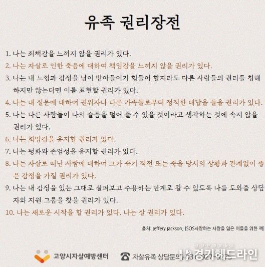 한편, 2019년 2월 개소한 고양시자살예방센터는 고양시민을 대상으로 무료 자살예방 상담, 자살예방 교육, 인식개선 활동 등을 지속적으로 추진하고 있다.