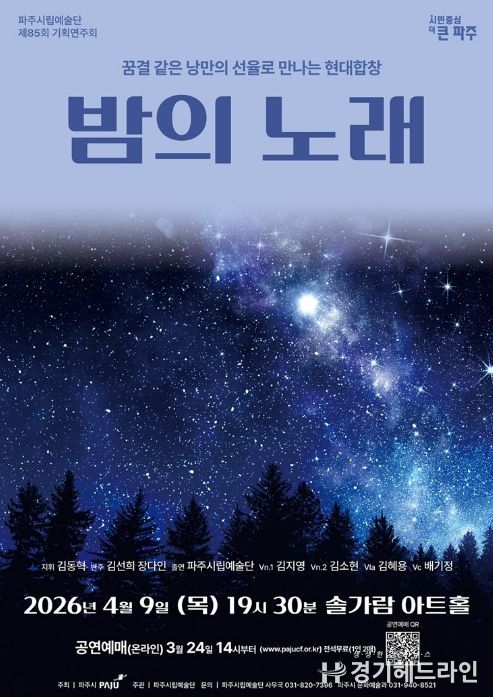 [경기헤드라인=김홍량 기자] 파주시는 파주시립예술단 제85회 기획공연 '밤의 노래'을 오는 4월 9일 19시 30분 솔가람아트홀에서 개최한다.