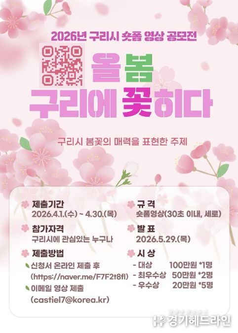 [경기헤드라인=문수철 기자] 구리시는 올해 새롭게 시작하는 봄꽃 축제 ‘장자호수 벚꽃마실 축제’를 효과적으로 홍보하고 시민과의 소통을 강화하기 위해 ‘2026 구리시 숏폼 영상 공모전 '올봄, 구리에 꽃히다'’ 접수를 4월 30일까지 진행한다고 밝혔다.