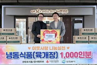 [경기헤드라인=문수철 기자] 의정부시는 4월 6일 ㈜창조식품‧콩사랑두부가 흥선‧호원권역 독거노인 등 취약계층 지원을 위해 냉동 육개장 1천 인분을 기탁했다고 밝혔다.