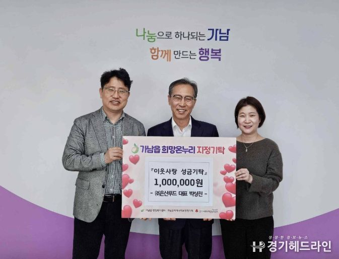 [경기헤드라인=정현수 기자] 여주시 가남읍 소재 (주)은산푸드는 지난 6일 가남읍 행정복지센터를 방문하여 관내 저소득 소외계층을 위한 이웃돕기 성금 100만 원을 전달했다.