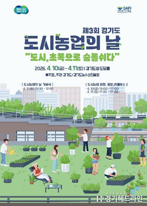 [경기헤드라인=문수철 기자] 도시농업 관련 체험행사와 직거래장터, 공연 등을 즐길 수 있는 ‘제3회 경기도 도시농업의 날 기념행사’가 오는 10일부터 11일까지 양일간 경기도청 도담뜰에서 열린다.