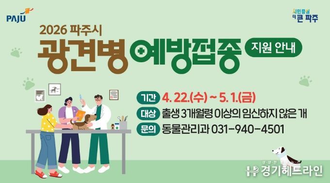 시는 광견병 예방 백신 7,000마리분을 무상 지원하며, 예방접종을 희망하는 반려견 보호자는 36개 지정 동물병원을 방문해 시술비 1만 원만 부담하면 접종이 가능하다. 참여 동물병원 목록은 파주시청 누리집에 게시된 공고문을 통해 확인할 수 있다.