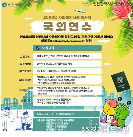 [경기헤드라인=문수철 기자] 인천시사회서비스원은 인천 사회복지시설 종사자를 대상으로 국외연수지원사업 참여자를 모집한다고 9일 밝혔다.