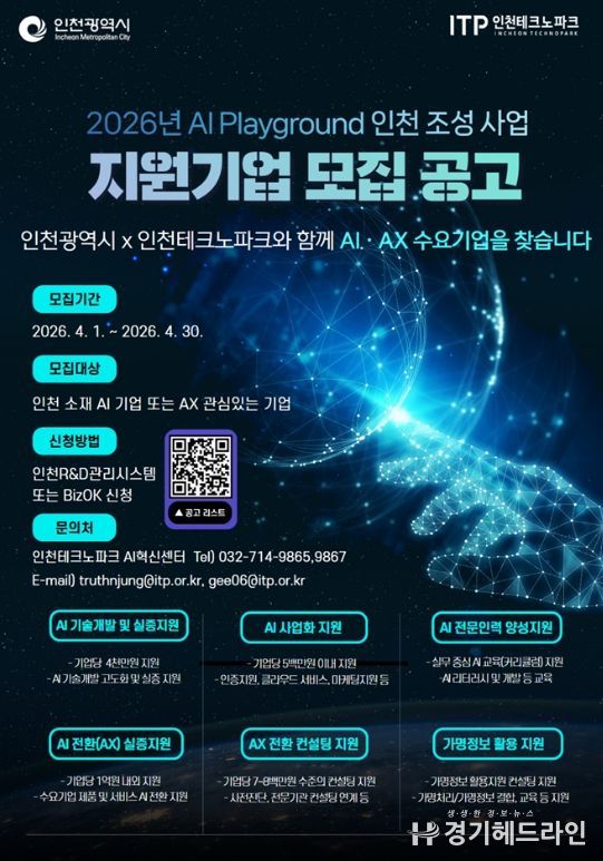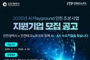 [경기헤드라인=문수철 기자] 인천테크노파크(인천TP)는 지역 중소기업의 인공지능 전환(AX) 촉진과 산업 경쟁력 강화를 위해 ‘2026년 AI 플레이그라운드 인천 조성사업’의 참여기업을 오는 30일까지 모집한다고 밝혔다.