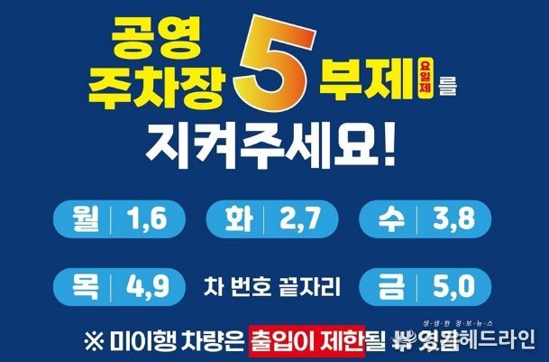 5부제 대상 차량은 차량번호 끝자리 숫자를 기준으로 월요일 1ܬ번 화요일 2ܭ번 수요일 3ܮ번 목요일 4ܯ번 금요일 5ܦ번이며, 5부제 의무 시행 주차장의 경우 5부제 대상 차량은 해당일에 입차가 제한될 예정이다. 다만, 장애인 차량·임산부·미취학 유아동승 차량, 전기·수소차량 등은 예외 대상으로 운영할 예정이다.