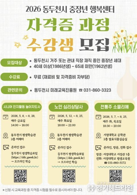 [경기헤드라인=김윤종 기자] 동두천시 미래교육진흥원은 지역 내 중장년층의 성공적인 인생 2막과 안정적인 사회 참여를 지원하기 위해 ‘2026년 중장년 행복센터 자격증 과정’ 수강생을 모집한다고 밝혔다.