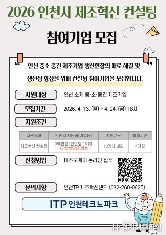 [경기헤드라인=문수철 기자] 인천테크노파크(인천TP)는 지역 중소·중견기업 제조 현장의 스마트화와 AX(AI 전환)·DX(디지털 전환)를 촉진하기 위해 ‘2026 인천시 제조혁신 컨설팅 지원사업’ 참여기업을 24일까지 모집한다고 밝혔다.