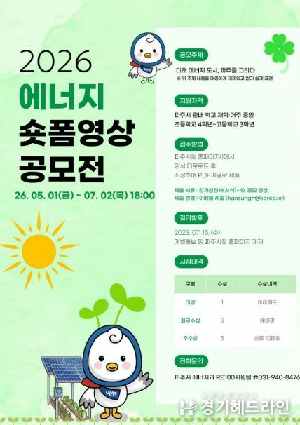 [경기헤드라인=김홍량 기자] 파주시는 청소년들의 에너지 인식을 제고하고 디지털 미디어 활용 역량을 강화하기 위해 녪년 파주시 청소년 에너지 숏폼 영상 공모전’을 개최한다.