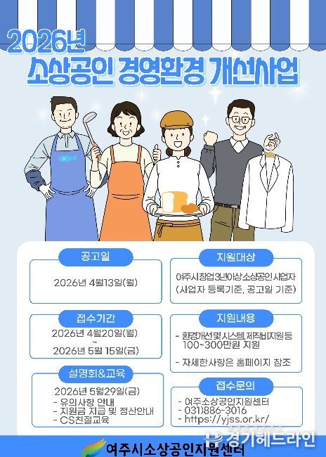 [경기헤드라인=정현수 기자] 여주시소상공인지원센터는 여주시 소상공인의 경영환경 개선과 사업 경쟁력 강화를 위해 '2026년 소상공인 경영환경 개선사업'을 추진한다고 밝혔다.