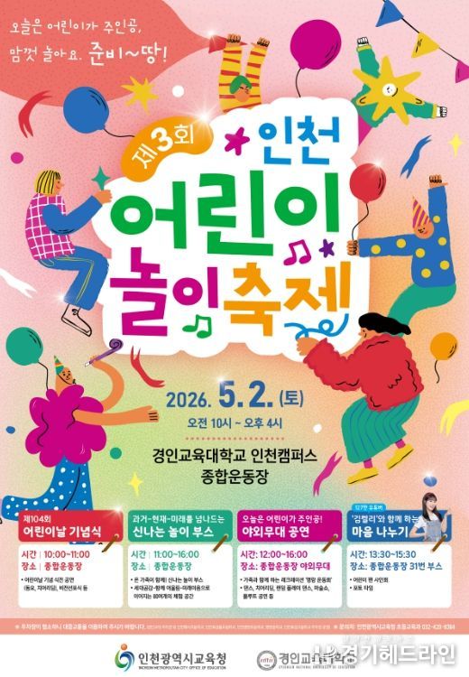 [경기헤드라인=문수철 기자] 인천광역시교육청은 5월 2일 경인교육대학교 인천캠퍼스에서 유·초등학생과 가족이 함께하는 ‘제3회 인천 어린이 놀이 축제’를 개최한다.