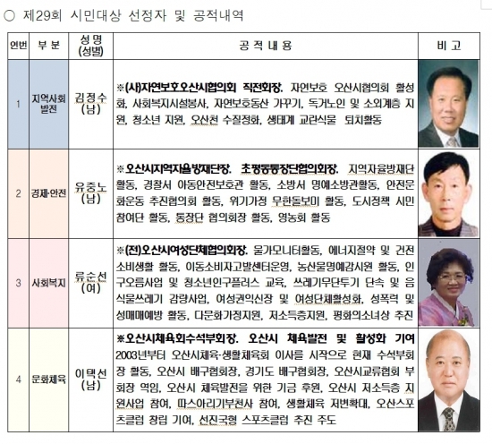 시민대상 수상자로는 △지역사회발전분야에 자연보호오산시협의회 직전회장으로서 자연보호협의회 활동을 통한 깨끗한 환경조성에 기여한 공로와 독거노인 및 저소득 소외계층을 지원해 온 공로를 인정하여 김정수(61세)씨, △경제안전분야에 지역자율방재 활동을 통한 안전오산을 조성한 공로로 오산시지역자율방재단장 유중노(68세)씨, △사회복지분야에 오산시 여성의 권익 증진 활동에 기여한 공로로 오산시여성단체협의회 직전회장 류순선(61세)씨, △문화체육분야에 오산시 체육·생활체육발전에 기여한 공이 큰 오산시체육회수석부회장 이택선(63세)씨가 선정됐다.
