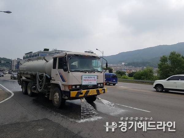 ▲ 오는 8월 말까지 폭염대비 도로 살수차 운영 하고 있다.(사진=광주시)[경기헤드라인=김성구 기자] 광주시가 폭염으로 인한 도로 복사열 저감을 위해 관내 주요도로에 살수차를 운영한다고 30일 밝혔다.