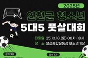 [경기헤드라인=김윤종 기자] (재)연천군청소년육성재단(청소년수련관)은 관내 거주·재학 및 관내 축구 클럽 소속 유치원생, 초·중학생 대상으로 연천종합운동장 보조경기장(연천군청소년수련관 옆)에서 “2025년 연천군 청소년 풋살대회”를 10월 18일(토) 개최한다고 밝혔다. 연천군 거주 또는 재학, 연천군 축구 클럽 소속인 유치원생·초등학생·중학생 대상으로 유치부 1개부, 초등부 3개부(1~2학년, 3~4학년, 5~6학년), 중등부 1개부 총 5개부로 진행하며, 각 8팀씩 총 40개팀을 선착순으로 모집한다. 모집기간은 9월 8일부터 9월 22일까지이며 참가비는 무료이다. 신청서 제출방법과 세부 대회 안내는 (재)연천군청소년육성재단 홈페이지 공지사항에 게시되어 있다. 우승팀에게는 트로피·메달 및 상금을 수여하며, 본 경기뿐만 아니라 경기를 보러 온 모든 분들이 함께 참여할 수 있는 이벤트도 진행할 예정이다. (재)연천군청소년육성재단 관계자는 “연천군 청소년 풋살대회가 청소년들의 체력증진과 공정한 스포츠정신, 팀워크, 성취감 등을 배울 수 있는 기회가 될 수 있도록 철저하게 대회를 준비하겠다.”고 말했다.