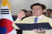 ▲ 1일 공식 취임한 이재명 제35대 경기도지사가 수원 경기도청 재난상황실에서 취임선서를 하고 있다. [경기헤드라인=문수철 기자] 1일 공식 취임한 이재명 제35대 경기도지사는 ‘경기도민께 드리는 약속’이라는 제목의 취임사를 통해 공정한 경기도를 만들겠다는 일성을 밝혔다. 태풍 쁘라삐룬 북상에 따라 당초 2일 의정부 경기도청 북부청사에서 개최될 예정이었던 취임식을 전격 취소하고, 태풍 관련 비상대책 회의로 업무에 착수한 이재명 신임 도지사는 별도의 취임식 없이 서면으로 취임사를 발표했다. 이 신임 도지사는 취임사를 통해 “경기도지사는 군림하는 존재가 아니라 도민의 명령을 성실하게 수행하는 대리인”이라며 “억울함이 없는 세상, 공정한 경기도를 만들라는 도민의 명령을 충실하게 따르겠다”고 말했다. 이어 “문재인 정부가 열고 있는 평화의 시대, 번영하는 나라를 지방정부가 든든하게 뒷받침해야 한다”며 “경기도를 남북 간 교류 협력, 나아가 동북아 평화경제공동체의 중심으로 만들겠다”고 밝혔다. 이 도지사는 도정 운영 방향에 대해 “복지를 확대해 도민들이 골고루 혜택을 누리게 하겠다”며 “부정부패, 예산낭비, 세금탈루를 없애고 도민의 혈세가 도민을 위해 제대로 쓰이게