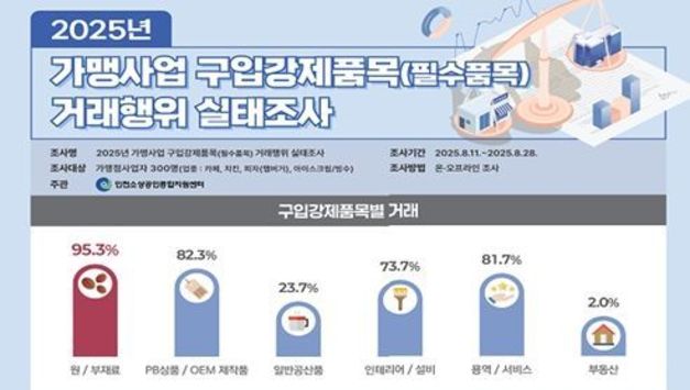 [경기헤드라인=문수철 기자] 인천신용보증재단 인천소상공인종합지원센터는 최근 개정된 가맹사업법령 시행 이후 가맹점사업자들이 겪는 경영 환경의 변화 추이를 확인하고 실질적인 고충을 파악하기 위해 실시한‘가맹사업 구입강제품목(필수품목) 거래행위 실태조사' 결과를 발표했습니다. 이번 조사는 결과를 바탕으로 가맹본부와 가맹점주 간의 공정거래 질서 확립과 실효성 있는 상생 정책 수립의 기반을 마련하고자 추진됐습니다. 이번 실태조사는 인천소상공인종합지원센터 주관으로 지난 2025년 8월 11일부터 8월 28일까지 18일간 진행됐으며, 치킨·커피·피자(햄버거)· 아이스크림/빙수 등 주요 외식업종 가맹점사업자 300명을 대상으로 온라인과 오프라인 방식을 병행하여 이루어졌습니다. 주요 실태조사 결과 요약 이번 조사는 ▲구입강제품목 거래 현황 ▲구입강제품목 거래에 따른 경영 부담 ▲최근 가맹사업법령 개정 이후 변화 체감 ▲가맹점사업자의 제도 개선 의견을 중점적으로 다루었으며, 그 결과는 다음과 같습니다. 1. 구입강제품목 거래 현황 분석 : 사실상 모든 가맹점주가 강제 구매 경험 응답자의 95