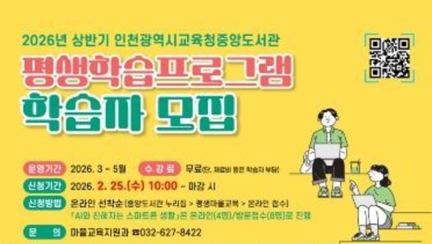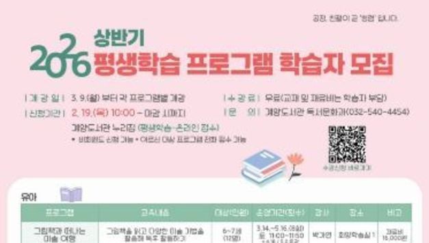 [경기헤드라인=문수철 기자] 인천광역시교육청평생학습관은 2월 10일부터 13일까지 ‘2026년 초등·중학 학력인정 문해교육’ 학습자를 모집한다 ‘학력인정 문해교육’은 비문해 및 저학력 성인을 대상으로 초·중학교 학력 취득 기회를 제공하기 위해 마련됐으며, 초등 및 중학 과정을 각 1~3단계로 세분화하여 3월 3일부터 12월 14일까지 운영한다. 평생학습관 관계자는 “이번 교육을 통해 학습자들이 배움의 즐거움을 되찾고, 학력 취득을 통해 자존감을 높일 수 있기를 기대한다”고 말했다. 모집에 대한 자세한 사항은 평생학습관 기획정보부로 문의하면 된다.