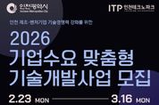 [경기헤드라인=문수철 기자] 인천테크노파크(인천TP)는 지역 제조벤처기업의 기술경쟁력 강화를 위해 ‘2026년 기업수요 맞춤형 기술개발사업’의 참여기업을 오는 3월 16일까지 모집한다고 밝혔다. 이번 사업은 인천 소재 제조벤처기업 중, 최근 5년 이내에 민간 액셀러레이터(AC)나 벤처캐피탈(VC) 등 적격 투자기관으로부터 투자를 유치한 기업을 대상으로 한다. 총 6개 내외의 과제를 선정해 기업당 최대 7,500만 원의 기술개발비를 지원할 계획이다. 지원금은 신규 채용 인건비, 전문가 활용비, 시제품 제작 및 성능 시험·평가 등 사업화와 상용화에 필요한 제반 비용으로 활용할 수 있다. 특히 선정 기업은 스케일업TIPS 운영사를 통해 지식재산권(IP) 경영진단 등의 컨설팅을 받게 된다. 이 중 성과가 우수한 기업은 스케일업TIPS 운영사로부터 10억 원 규모의 직접 투자와 함께 스케일업TIPS 프로그램 추천 기회를 얻을 수 있다. 최종적으로 스케일업TIPS에 선정되면 향후 3년간 총 20~30억 원의 R·D 자금을 후속 지원을 받을 수 있다. 사업 신청은 3월 16