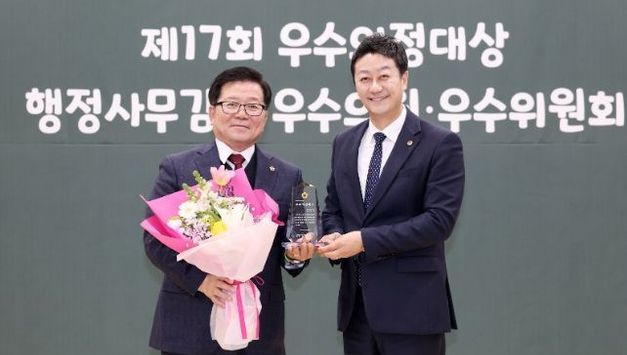 [경기헤드라인=문수철 기자] 경기도의회 안전행정위원회 국중범 의원(더불어민주당, 성남4)이 26일 경기도의회 대회의실에서 열린 '2025년 경기도의회 시상식'에서 제17회 우수의정대상을 수상했다. 우수의정대상은 대한민국시도의회의장협의회가 남다른 열정과 헌신적인 의정활동을 통해 지역주민의 복리 증진과 지방자치 발전에 기여한 의원에게 수여하는 상으로, 올해는 경기도의회 의원 44명이 선정됐다. 국중범 의원은 재난·안전 분야를 중심으로 한 성실한 의정활동과 현장 중심의 정책 점검을 통해 도민의 안전과 권익 증진에 기여한 공로를 인정받아 이번 수상의 영예를 안았다. 국 의원은 “이번 수상은 개인의 성과라기보다, 지역 주민과 함께 호흡하며 현장에서 답을 찾기 위해 노력한 결과”라며, “앞으로도 도민의 삶에 실질적인 도움이 되는 의정활동으로 지방자치 발전에 기여하겠다”고 밝혔다. 한편, 이날 시상식은 제17회 우수의정대상 시상과 함께 2025년 행정사무감사 우수의원·우수위원회 시상 등이 함께 진행됐다.