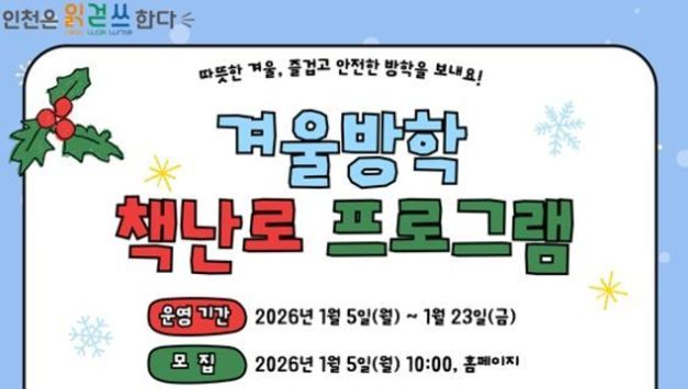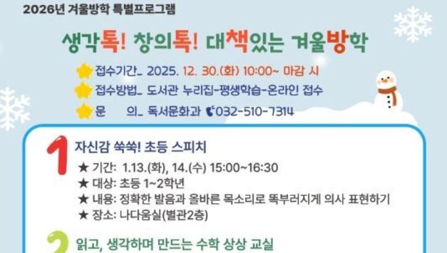 [경기헤드라인=문수철 기자] 인천광역시교육청부평도서관은 2026년 1월 19일부터 21일까지 초등학교 4학년 20명을 대상으로 겨울독서교실 ‘사고력 쑥! 문해력 점프! 독서캠프’를 운영한다. 이번 프로그램은 그림책 필사, 가치 경매 게임, 읽기·사고력 활동, 노트 커버 꾸미기, 디지털 드로잉, 신문 토론 등 다양한 독서·독후활동으로 구성해 사고력과 문해력 향상을 돕는다. 참가 신청은 2026년 1월 2일 오전 10시부터 부평도서관 누리집에서 가능하며, 수업은 부평도서관 나래울실에서 대면으로 진행된다. 자세한 사항은 부평도서관 누리집을 확인하거나 어린이자료실로 문의하면 된다.