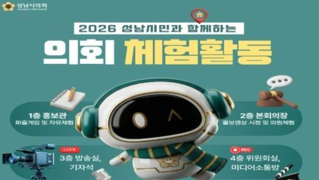 [경기헤드라인=문수철 기자] 성남시의회는 시민과의 소통을 강화하고 의회의 역할을 알리기 위해 ‘2026 성남시민과 함께하는 의회 체험활동’을 오는 3월부터 11월까지 운영한다. 이번 체험활동은 의회의 역할과 기능을 시민들이 직접 보고 체험할 수 있도록 마련된 프로그램으로, 홍보관·본회의장·미디어소통방 등을 둘러보는 일정으로 구성된다. 참여를 희망하는 경우 성남시의회 홈페이지를 통해 신청하거나 의회사무국 홍보팀으로 유선 문의하면 된다. 안광림 부의장은 “의회 체험활동이 시민 여러분께 지방의회의 역할을 이해하는 뜻깊은 시간이 되길 바란다”며 “성남시의회는 앞으로도 시민과 더 가까이 소통하는 열린 의회를 만들기 위해 다양한 참여 프로그램을 지속적으로 운영해 나가겠다”고 말했다.