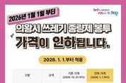 [경기헤드라인=문수철 기자] 의왕시가 물가 상승 및 경기 침체로 인한 시민들의 경제적 부담을 완화하기 위해 2026년 1월 1일부터 쓰레기 종량제봉투 판매가격을 인하한다. 이번 가격 인하 대상은 일반용 및 재사용 종량제봉투이며, ▲5리터 봉투는 190원에서 150원으로 ▲10리터 봉투는 350원에서 300원으로 ▲20리터 봉투는 680원에서 550원으로 인하된다. 또한, ▲50리터 봉투는 1,700원에서 1,400원으로 ▲75리터 봉투는 2,630원에서 2,100원으로 각각 조정된다. 가격 인하 이전에 구매한 종량제봉투는 그대로 사용 가능하고, 음식물 종량제봉투, 공사장 생활폐기물 포대, 대형폐기물 신고필증은 가격 등은 변동 없다. 김성제 시장은 “종량제봉투는 시민 생활과 밀접한 만큼, 이번 가격 인하가 가계 부담 완화에 도움이 되길 바란다”며, “가격 인하 시점이 2026년 1월 1일이므로, 그전까지 각 가정에서 필요한 양만 구입해 주시길 바란다”고 전했다.