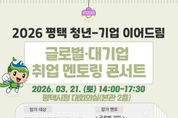 [경기헤드라인=문수철 기자] 평택시는 기업 현직자들의 취업 멘토링을 통해 실질적인 취업 준비를 지원하고 인적 네트워크 형성 기회를 제공하기 위한 '평택 청년-기업 이어드림 ‘글로벌·대기업 취업 멘토링 콘서트’' 참여자를 오는 20일까지 모집한다고 밝혔다. 취업 멘토링 콘서트는 오는 3월 21일 평택시청 대회의실에서 평택 거주 또는 활동 중인 19세부터 39세까지의 구직 청년 100여 명을 대상으로 진행되며, 삼성·SK·LG·나이키·아마존·J&J·KT 등 13개 기업의 현직자들이 취업특강, 직무 토크쇼 질의응답(Q&A), 공개 모의 면접, 그룹 멘토링을 통해 실질적인 취업 정보 및 현실적인 조언과 경험을 제공할 예정이다. 참여 신청은 모집 포스터의 정보무늬(QR코드)를 통해 접수하면 된다. 기타 자세한 사항은 평택시청 누리집을 참고하거나 청년정책과로 문의하면 된다.