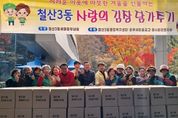 [경기헤드라인=문수철 기자] 광명시 철산3동 새마을부녀회는 지난 19일부터 20일까지 이틀간 철산3동 행정복지센터 앞마당에서 ‘사랑의 김장 나누기’ 행사를 열었다. 이번 행사에는 철산3동 새마을부녀회와 유관 단체 회원 50여 명이 참여해 정성껏 담근 김장김치를 취약계층 62가구에 10kg씩, 관내 경로당 9곳에는 20kg씩 전달했다. 또한 한국마사회 광명지사와 광명동부 새마을금고 등 지역의 여러 기관·단체가 따뜻한 나눔에 함께했다. 임순자 회장은 “물가 상승으로 김장 준비가 어려운 이웃들에게 정성껏 담근 김치가 따뜻한 마음으로 전해지길 바란다”며 “앞으로도 회원들과 함께 나눔과 봉사를 꾸준히 이어가겠다”고 전했다. 손영만 동장은 “쌀쌀한 날씨에도 이웃 사랑을 실천한 새마을회원들과 유관 단체원들에게 감사하다”며 “이번 김장 나눔으로 어려운 이웃들이 따뜻한 겨울을 보내길 바란다”고 말했다. 한편, 철산3동 새마을부녀회는 이웃돕기 바자회, 불고기·반찬 나눔, 거리 청소 등 다양한 봉사활동으로 따뜻하고 살기 좋은 지역사회 조성에 힘쓰고 있다.