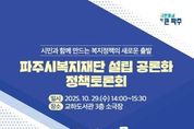 [경기헤드라인=김홍량 기자] 파주시는 오는 29일 14시, 교하도서관 3층 소극장에서 ‘파주시복지재단 설립 공론화 정책토론회’를 개최한다고 밝혔다. 이번 토론회는 파주시복지재단 설립을 앞두고 시민, 전문가, 현장 종사자의 다양한 의견을 수렴해 재단 설립의 필요성과 발전 방향을 함께 모색하기 위해 마련됐다. 토론회는 김민철 서영대학교 사회복지행정학과 교수의 기조 강연을 시작으로, 파주시 복지기획팀장의 주제 발표가 이어진다. 이어 한지원 두원공과대학교 교수가 좌장을 맡아 토론을 진행하며, 이보경 파주시문산종합사회복지관 관장, 오민수 경기복지재단 선임연구위원, 박윤근 화성시복지재단 사업본부장 등이 참석해 열띤 논의를 펼칠 예정이다. 토론에서는 ▲파주시복지재단 설립의 필요성과 추진 개요 ▲파주시 여건을 반영한 복지재단의 발전 방향 ▲재정 자립 및 지속가능성 확보 방안 등 다양한 주제가 심도 있게 논의될 예정이다. 김은숙 복지정책국장은 “파주시복지재단은 시민의 삶을 보다 세밀하게 지원하고, 지역 현장의 목소리를 반영한 ‘파주형 복지모델’을 실행할 구심점이 될 것”이라며, “이번 토론회를 통해 파주시 복지 정