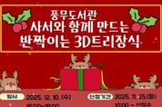 [경기헤드라인=문수철 기자] 김포시 풍무도서관에서 초등학생을 대상으로 ‘사서와 함께 만드는 반짝이는 3D트리장식’을 오는 12월 10일 오후 4시부터 6시까지 운영한다. 이번 프로그램은 수강생의 학년에 따라 제작 도구의 난이도와 창작물이 구분되며, 참여 학생의 수준에 맞춘 맞춤형 체험활동으로 운영된다. 3D펜을 활용한 제작 경험을 통해 공간·입체 감각을 향상시키는 동시에 연말 크리스마스 시즌의 특색있는 분위기를 느낄 수 있다. 특히 풍무도서관 특화담당 사서가 직접 프로그램을 진행함으로써 안전하고 체계적인 지도가 이뤄질 것이다. 참여 신청은 11월 25일 오전 10시부터 풍무도서관 홈페이지에서 가능하며, 초등학생(1~6학년) 총 12명을 선착순 모집한다.