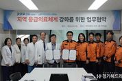 [경기헤드라인=문수철 기자] 남양주소방서는 지난 26일 현대병원에서 중증응급환자의 신속한 처치와 효율적인 이송체계 구축을 위한 ‘중증응급환자 1차 진료권 확보 업무협약(MOU)’을 체결했다고 밝혔다. 이번 협약은 중증응급환자 발생 시 골든타임 내 협약 의료기관인 현대병원에서 1차 필수 응급처치를 실시해 환자 상태를 우선 안정화하고, 추가 전문치료가 필요한 경우 119구급대가 상급종합병원으로 전원을 지원하는 역할 분담 체계를 구축하기 위해 추진됐다. 이날 협약식에는 남양주소방서장과 현대병원장을 비롯한 양 기관 관계자 10여 명이 참석해 세부 실행 방안을 논의했으며, 이번 협약을 통해 병원 수용 지연을 최소화하고 치료 개시 시점을 앞당겨 응급환자 소생률 향상에 기여할 것으로 기대된다. 김부섭 현대병원장은 “병원의 수용 능력은 한정적이나, 소방과의 협력을 통해 1차 처치 후 전원이 보장되는 체계가 정착된다면 보다 적극적인 환자 수용이 가능할 것”이라며 “지역 거점 의료기관으로서 환자 생존율 향상에 최선을 다하겠다”고 밝혔다. 나윤호 남양주소방서장은 “구급현장에서는 수용병원 선정이 가장 큰 어려움”이라며