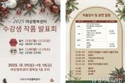 [경기헤드라인=문수철 기자] 구리시 여성행복센터는 12월 1일부터 12월 12일까지 2주간 ‘2025년 수강생 작품 전시 및 발표회’를 개최한다고 밝혔다. 이번 행사는 여성행복센터 행복동 1층에서 진행되며, 한 해 동안 수강생들이 갈고닦은 실력을 선보이는 자리다. 생활 속 문화예술 참여를 확대하고 시민의 문화 향유 기회를 높이는 동시에 여성행복센터 프로그램에 관한 관심을 높이기 위해 마련됐다. 전시장에는 양재 소품, 나만의 옷 만들기, 꽃꽂이, 가죽공예, 서양화, 한국화 등 총 9개 강좌에서 제작한 약 120점의 작품이 전시된다. 또한 플루트, 바이올린, 통기타 음악 강좌 수강생들의 발표 공연도 함께 진행되어 다채로운 즐길 거리를 제공할 예정이다. 백경현 구리시장은 “추워지는 연말, 여성행복센터 수강생들의 작품발표회가 시민들의 마음을 따뜻하게 채우는 시간이 되길 바란다”라고 전했다. 한편, 구리시 여성행복센터는 2025년에 5개 교육과정, 총 72개 강좌를 실시해 2,754명이 교육을 수료했으며, 2026년 1기 수강생 모집은 12월 15일부터 28일까지 진행될 예정이다. 자세한 사항은 여성행복센터