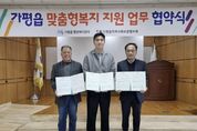 [경기헤드라인=문수철 기자] 가평군 가평읍 행정복지센터는 최근 가평읍지역사회보장협의체(지사협), 유일닭강정과 ‘맞춤형복지 지원 업무협약’을 체결했다. 이번 협약으로 유일닭강정은 매월 가평읍 맞춤형복지팀에서 추천한 저소득계층 10가정에 닭강정을 지원해 주기로 했다. 장석조 가평읍장은 “복지사각지대 발굴뿐 아니라 민간 자원 연계가 복지 수준을 높이는 데 큰 역할을 한다”며 “이번 협약이 공공자원만으로는 충족하기 어려웠던 복지수요를 보완하는 데 큰 도움이 될 것”이라고 말했다. 유병훈 유일닭강정 대표는 “우리 지역 주민들과 마음을 나누고 싶어 맞춤형복지 지원 협약에 참여했다”며 “앞으로도 어려운 이웃을 위한 나눔과 봉사를 꾸준히 실천하겠다”고 밝혔다.
