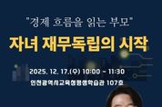 [경기헤드라인=문수철 기자] 인천광역시교육청평생학습관은 17일 고3 학부모를 대상으로 부모쉼표 특강 ‘경제 흐름을 읽는 부모: 자녀 재무독립의 시작’을 운영한다. 이번 특강은 자녀의 사회진입을 앞둔 학부모가 변화하는 경제 환경을 이해하고, 준비된 시각에서 자녀의 재무독립을 지원하도록 돕는 프로그램이다. 강의는 전 증권사 애널리스트이자 경제·투자 리서치사 ‘광수네 복덕방’의 이광수 대표가 맡아 부모 역할, 경제 변화의 기본 이해, 가정에서 실천 가능한 경제 소통 방법 등을 안내한다. 참여 대상은 인천 관내 고3 및 관심 있는 학부모 100명이며, 신청은 12월 3일 오전 10시부터 평생학습관 누리집에서 선착순으로 받는다. 자세한 사항은 평생학습관 누리집 공지사항 또는 평생교육부로 문의하면 된다.