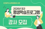 [경기헤드라인=문수철 기자] 인천광역시교육청중앙도서관은 지역 주민에게 다양한 학습 기회를 제공하기 위해 ‘2026년 평생학습프로그램’ 강사를 공개 모집한다. 2026년 정규 평생학습프로그램은 상반기(3~5월)와 하반기(9~11월)로 나뉘어 각각 8회씩 운영되며, 모집 분야는 유아 대상 독후활동, 초등 1~2학년 대상 초등 영어, 성인 대상 AI 활용과 동영상 제작, 우쿨렐레, 금융·경제 등 총 5개 분야다. 서류 접수는 12월 23일부터 29일 오후 5시까지이며, 중앙도서관 누리집 공지사항에서 제출 서식을 내려받아 작성한 뒤 관련 서류와 함께 이메일로 제출하면 된다. 강사는 1차 서류심사와 2차 면접심사를 거쳐 최종 선정된다. 자세한 사항은 중앙도서관 누리집에서 확인할 수 있으며, 문의는 마을교육지원과로 하면 된다.