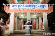 [경기헤드라인=문수철 기자] 진접읍 봉선사에서 2026년 희망 가득한 새해를 기원하는 제야의 종소리가 울려 퍼졌다. 남양주시의회(의장 조성대)는 31일 진접읍에 위치한 대한불교조계종 제25교구 봉선사(주지 호산스님)에서 열린‘2026년 봉선사 새해맞이 타종식’에 참석해 시민들과 함께 병오년(丙午年) 새해의 힘찬 출발을 함께했다. 봉선사가 주관한 이날 행사는 조성대 의장을 비롯해 이정애 부의장, 이경숙 복지환경위원장, 김지훈(국) 의원, 김동훈 의원, 이수련 의원, 김상수 의원, 손정자 의원 및 주광덕 남양주시장, 지역 국회의원, 봉선사 관계자 및 신도, 지역주민 등 300여명이 참석했다. 행사는 송년법회를 시작으로 △교구장 호산스님의 인사말씀 △새해 덕담 및 송년 인사 △발원문 △봉선사 대종 소개 △타종 순으로 진행됐으며, 한파로 인한 추운 날씨 가운데서도 타종식에 참석한 시의원들과 시민들은 덕담과 따뜻한 온기를 나누며 훈훈한 새해를 함께 맞이했다. 특히, 주요 내외빈의 타종 이후 일반 시민들도 함께 타종자로 참여하는 순서를 마련해 새해맞이 타종식의 의미를 더했다. 조성대 의장은 “시